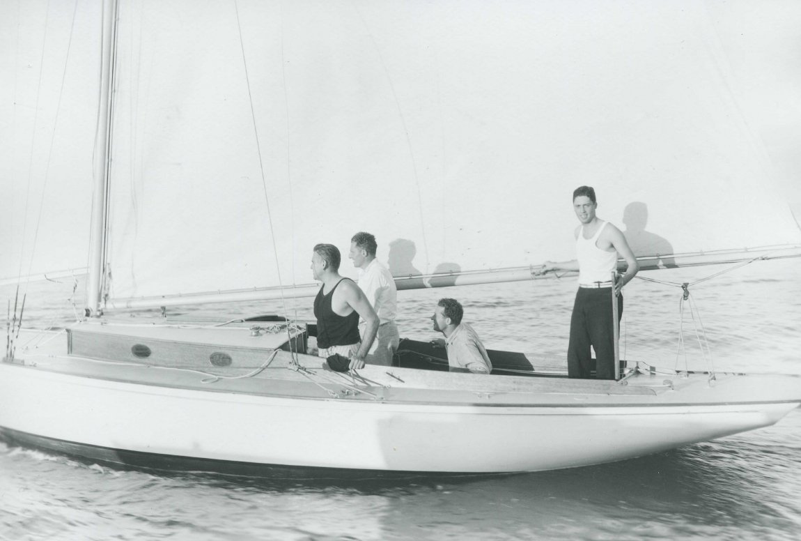 Crew of SUSAN, Sound Inter Club, #13, International Interclub Races, 1933: Emil Mosbacher, Sr., Albert or Larry Marx (?), Lawrence Marx (?), Lou Pierson.